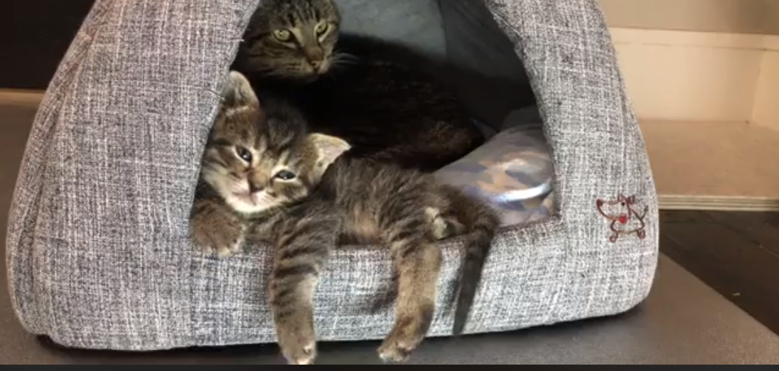 The kitten lay on his back and contemplated the ceiling, and his current situation. He didn’t know how, but he had somehow rolled into a sort of ditch where the blanket had pulled away from the edge of the bed and created a gap, and he was stuck. He flailed a little, uselessly, flapping his feet in an effort to roll himself onto his stomach. He stretched, he twisted, he flailed again, he squeaked in protest – to no avail. He ceased his struggles for a while in order to get his breath back. As he lay quiet, still contemplating the same patch of ceiling, he became aware of a low, rhythmic rumbling sound close to his ear. There was a source of heat close to his face, and some bristly fur was tickling his nose, making him want to sneeze.